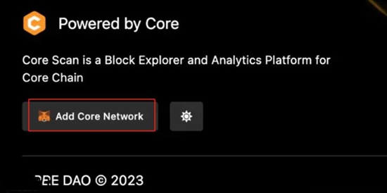 4、转到https://scan.coredao.org/并在页面上一直向下滚动点击“添加核心网络”按钮