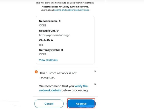 5、在您的 Mask中批准,执行以上步骤后,下次访问网络选择器时,您将能够看到核心网络
