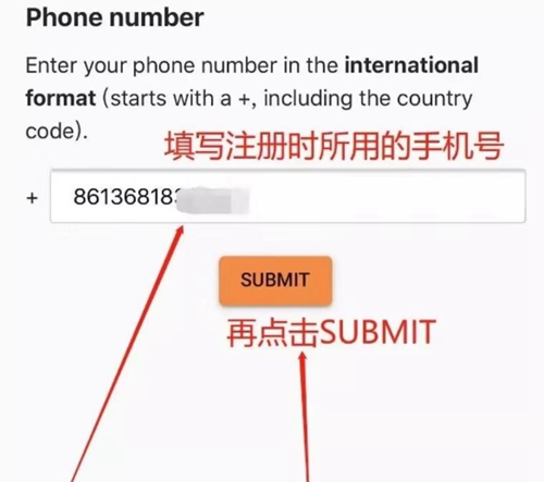 4、填写注册时的手机号码,点击“SUBMIT”