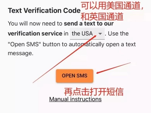 5、可以选择美国通道或英国通道,点击“OPEN SMS”(打开短信)