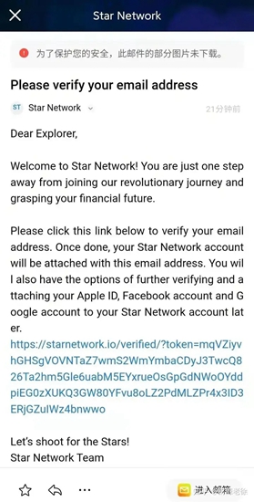 6. 邮箱验证(邮箱会收到StarNetwork的信息,打开点击蓝色字体部分链接进入验证即可,要使用电脑或者下载 QQ邮箱进入完成此操作)