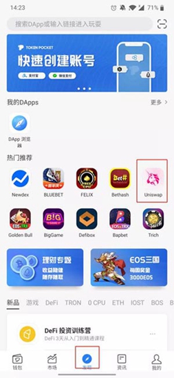 1、打开TP钱包,点击【发现】进入发现界面后,找到 Uniswap 并点击进入。