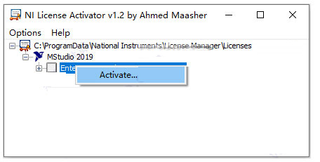 4、运行破解文件“NI License Activator 1.2.exe”找到MStudio 2020选中,右键点击激活;